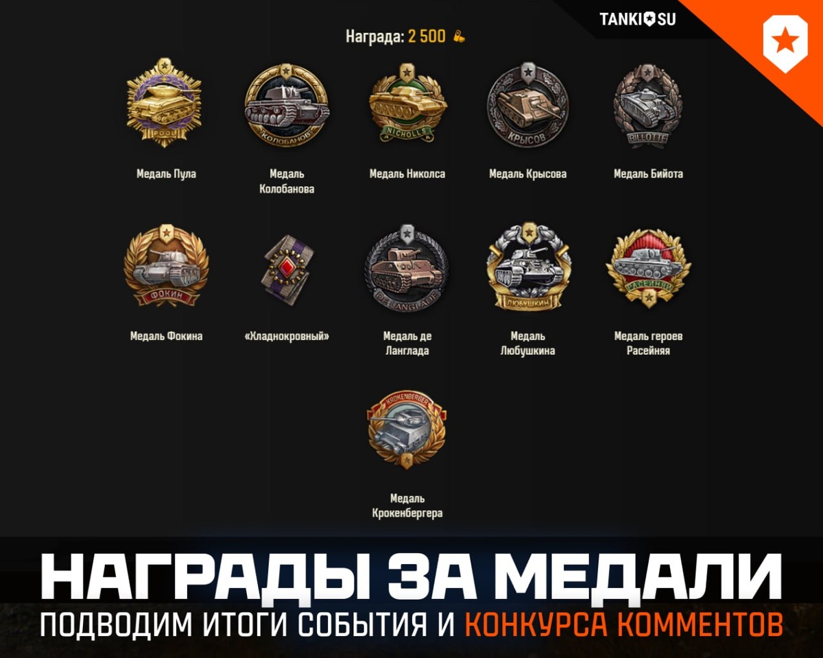 начислено на аккаунты? Кто выиграл в конкурсе комментов? Рассказываем в этом посте! ㅤ ⭐️ 1 611 064 медалей получили игроки за время события! 💰 Было начислено 21 580 520 золота! ㅤ 💡 А вот как распределились редкие медали с картинки: 🥇 Медаль героев Расейняя — 3 шт. 🥈 Медаль Любушкина — 7 шт. 🥉 Медаль де Ланглада — 43 шт. • Медаль Фокина — 78 шт. • Медаль Пула — 118 шт. • Звание «Хладнокровный» — 250 раз • Медаль Бийота — 287 шт. • Медаль Колобанова — 333 шт. • Медаль Николса — 504 шт. • Медаль Крысова — 506 шт. • Медаль Крокенбергера — 1 102 шт. 👑 Абсолютный хит — звание «Дуэлянт»: его получили 473 137 раз!