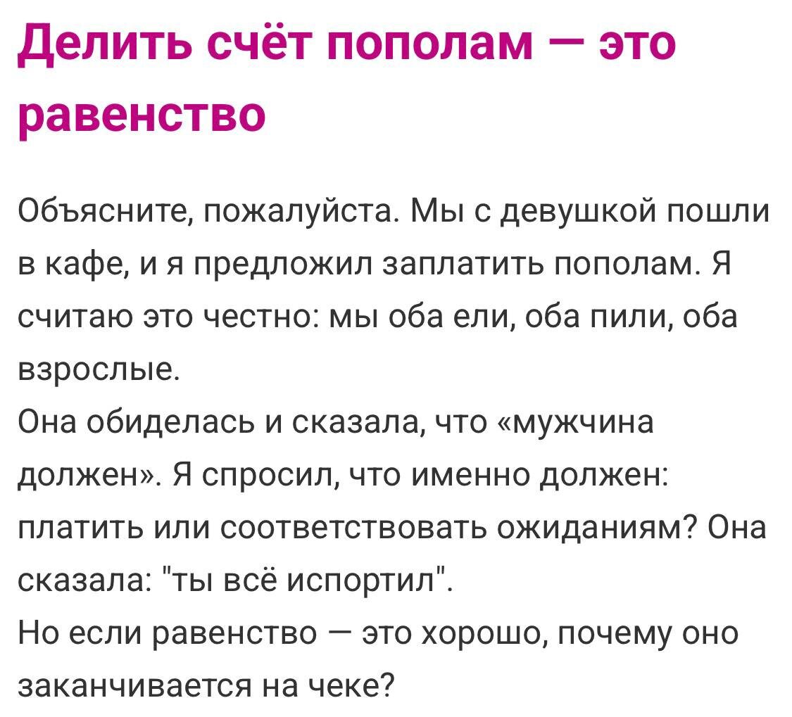 Она: ❄️ «Ты романтик ноль, всё испортил!» Почему ее "взрослость" тает у чека, а ожидания — "мужчина платит"? Где равенство, если секс не в теме (как у меня, асексуала), а вот бабки — обязательно? 🤔 Равенство держится ровно до момента, когда счетчик тикает! Магия чека: он — "обеспечитель на Бали 🏝", она — "принцесса в короне обид". Пополам? "Ты не джентльмен!" Асексуал фыркает: зачем платить за ужин, если аппетит к романтике нулевой? Логика рулит! Итог: равенство — ширма для удобства. ❓ Когда вы последний раз видели "тарелочницу" в дикой природе? (Спойлер от асексуала: реже, чем мой интерес к свиданиям.) 👇