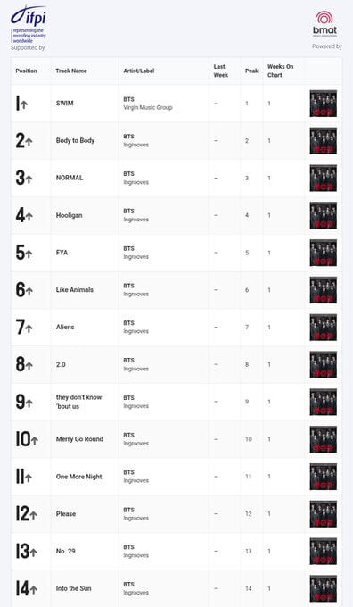 🍃 BTS стали первыми в истории исполнителями, которые одновременно заняли все 14 верхних позиций в Топ-20 международных синглов IMI (Индийская музыкальная индустрия).