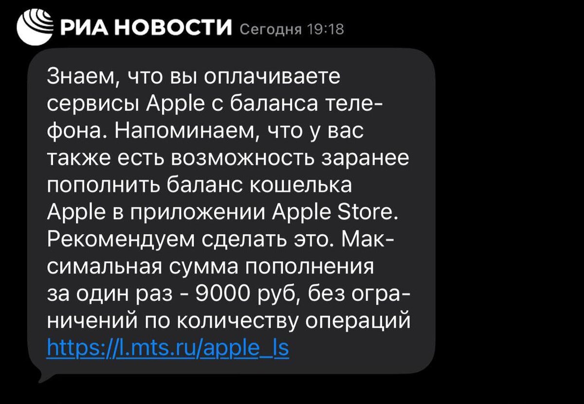 «Знаем, что вы оплачиваете сервисы Apple с баланса телефона. Напоминаем, что у вас также есть возможность заранее пополнить баланс кошелька Apple в приложении Apple Store. Рекомендуем сделать это. Максимальная сумма пополнения за один раз — 9000 руб, без ограничений по количеству операций», — пишет МТС в смс. А «Билайн» рекомендует пополнить баланс на год. «По сообщению ряда СМИ, в ближайшее время у всех операторов может быть отключена оплата Apple со счета телефона. Чтобы сохранить доступ к подпискам, рекомендуем пополнить баланс Apple ID, например, на год», — пишет оператор. ⭐️ Прислать новость в TN 📲 TN в MAX