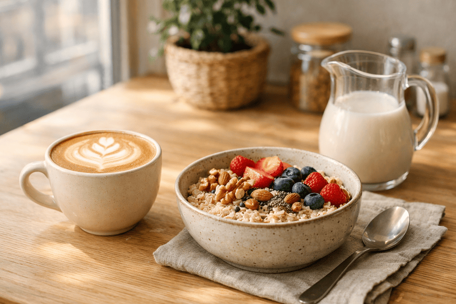 Сильная сторона овсяного варианта — универсальность. Мягкий вкус, нейтральный аромат и приятная консистенция делают его удобным для кофе: он хорошо пенится, создаёт однородную текстуру и подчёркивает зерно, не споря с ним. Для дома это один из самых простых сценариев — напиток редко «ведёт себя неожиданно» при нагревании или смешивании.