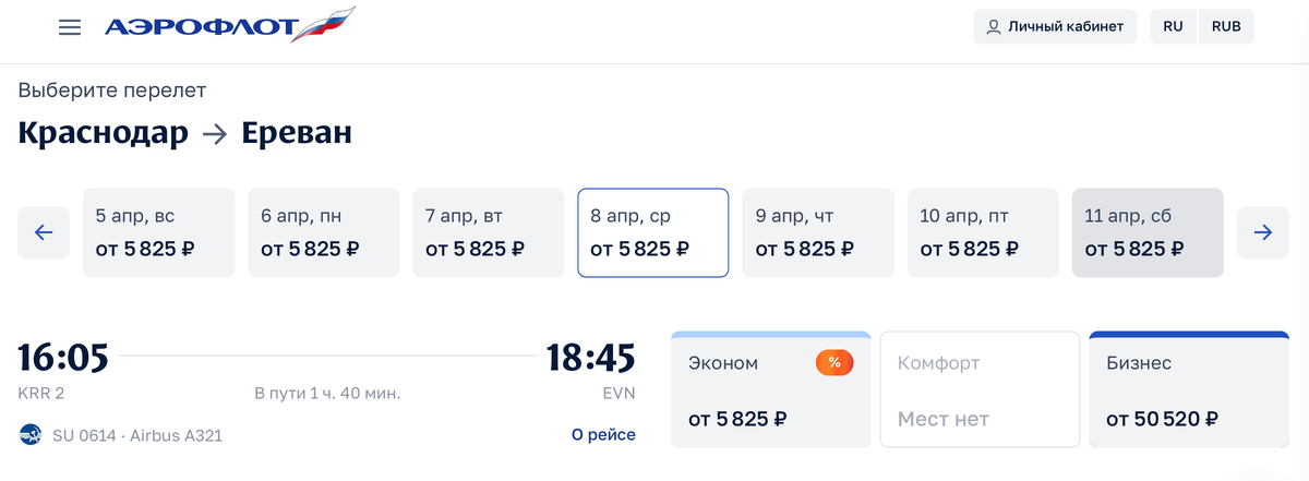 Перелет из Краснодара в Ереван бизнес-классом авиакомпании Аэрофлот