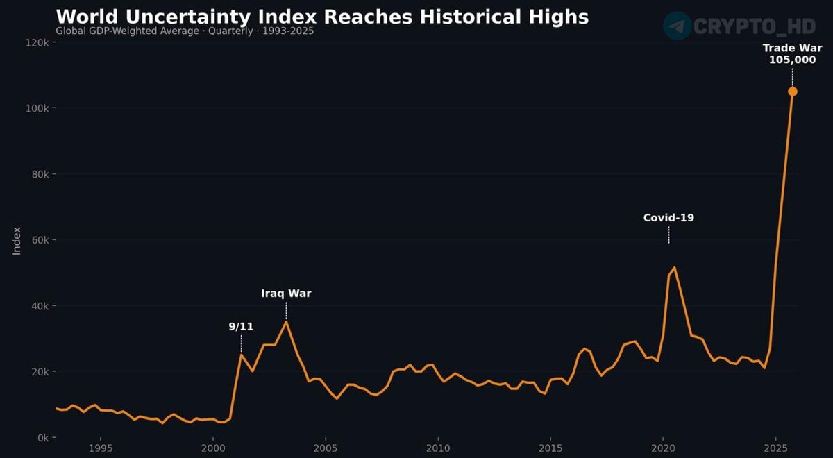 🤯 Индекс мировой неопределенности – исторический максимум. Даже во время COVID-19, финансового кризиса 2008 года и других крупных шоков с 1990 года уровень неопределенности был значительно ниже. World Uncertainty Index (WUI) – это глобальный показатель уровня экономической и политической неопределенности, основанный на частоте упоминаний неопределенности в аналитических отчетах. Влияние роста WUI на рынок: усиливается ощущение риска, компании и инвесторы становятся осторожнее, снижается инвестиционная активность и растет волатильность. Crypto Headlines