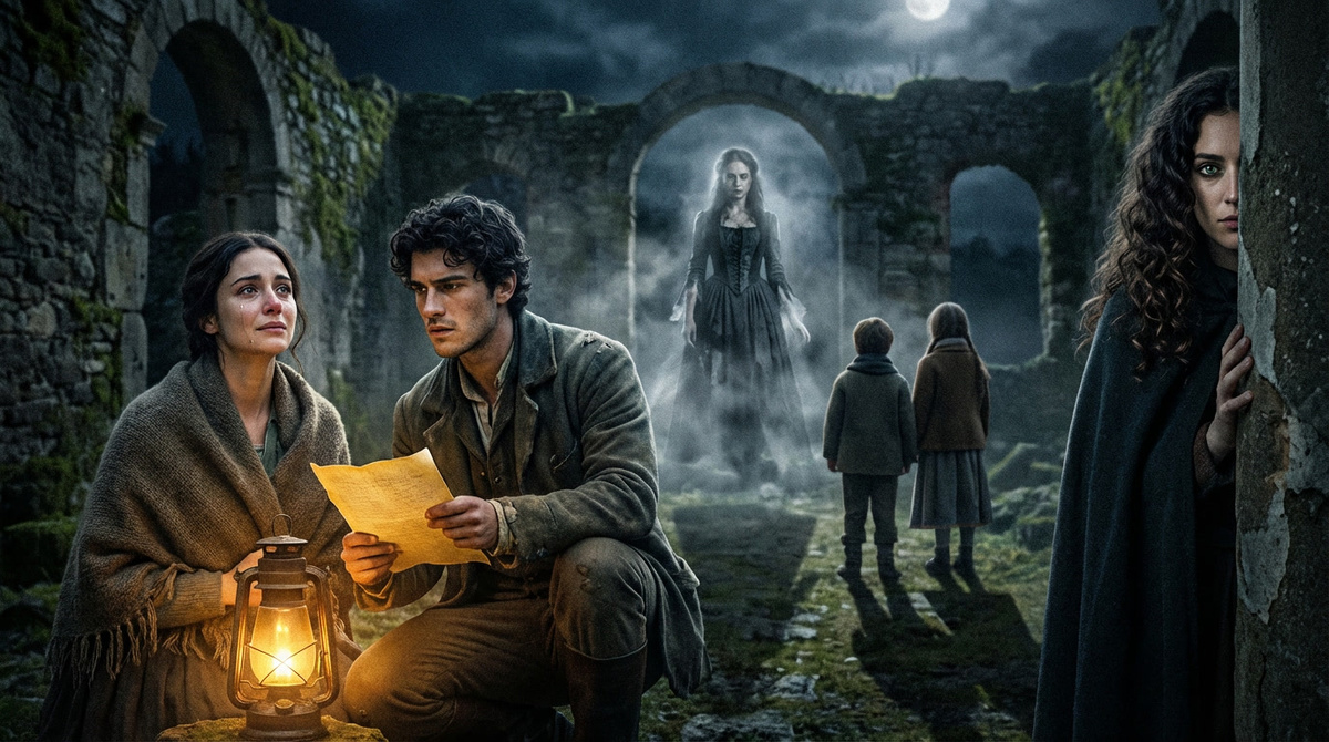 Вокруг них воздух начал сгущаться, зашелестели сухие листья, хотя ветра не было. Из тени выступила женская фигура в старинном платье. Её лицо было печальным, но спокойным.