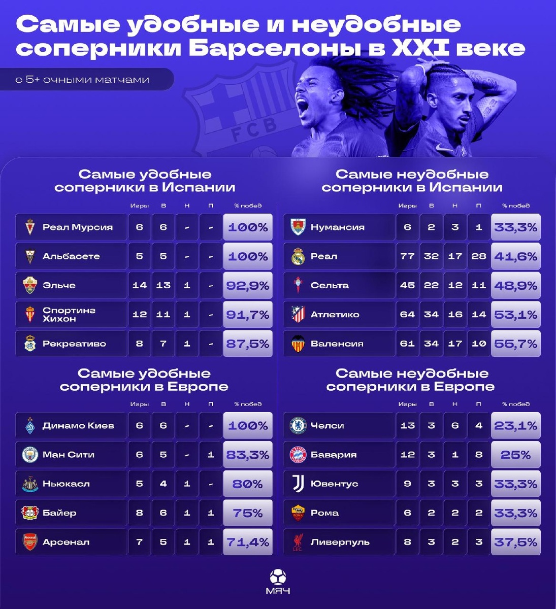 Самые удобные и неудобные соперники «Барсы» в XXI веке Неожиданно часто у каталонцев были проблемы с «Челси», «Ромой», «Ювентусом» и… «Нумансией». Последние даже помешали «Барсе» попасть в ЛЧ-2001/02, отобрав 4 очка за сезон – при этом сами заняли 20-ю строчку. Зато каталонцы почти всегда обыгрывают «Арсенал» (в 5 матчах из 7). Так что, если такой полуфинал ЛЧ состоится, эта стата точно даст им эмоциональный буст. А еще больше интересного о «Барсе» в XXI веке смотрите в нашем ролике, который выйдет в 18:00 👀 @myach | МЯЧ в Max