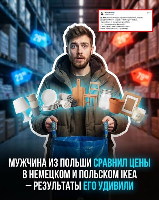 Пользователь соцсети X сравнил цены на одинаковые товары в IKEA в Польше и Германии. В анализ вошёл 51 продукт из ассортимента «шведского сети». По результатам сравнения: – в 44 случаях товары оказались дешевле в Германии – только 7 позиций выгоднее в Польше – в среднем покупатели в Польше платят на 12,69% больше Наиболее заметная разница – в категории продуктов питания. Например, замороженный лосось (500 г) в Польше стоит около 85 zł, тогда как в Германии – примерно 55 zł. Разница составляет около 30 zł за тот же продукт. Схожая ситуация наблюдается и с другими товарами: вафли, напитки и фрикадельки также дешевле в немецкой IKEA. В целом, при покупке всех сравниваемых товаров, потребитель в Польше переплатит около 186,91 zł по сравнению с покупателем в Германии. При этом отдельные товары, такие как горчица или некоторые напитки, остаются дешевле в Польше, однако они не влияют на общую тенденцию. Автор отмечает, что различия могут быть связаны с особенностями ценообразования и восприя