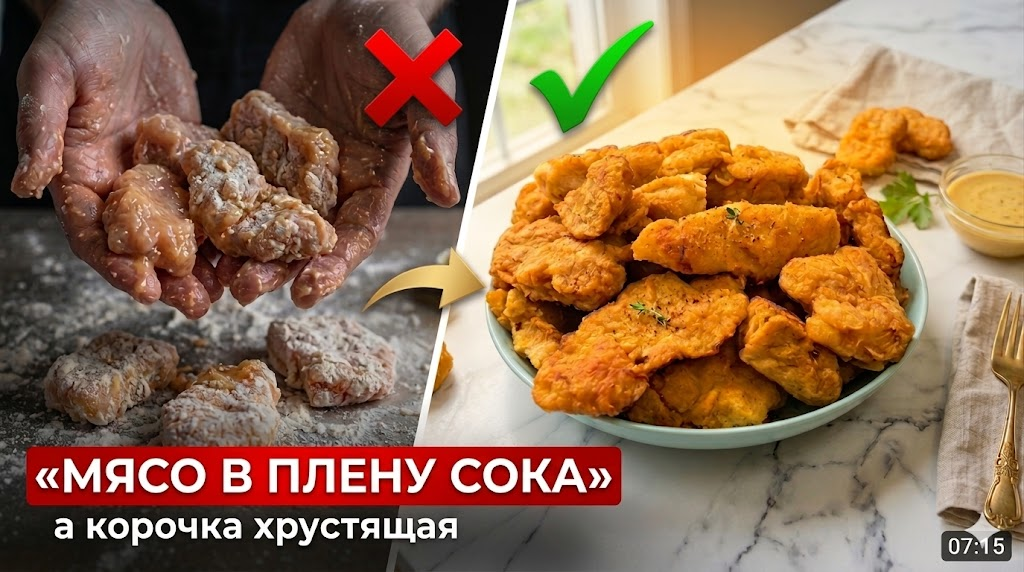 Девочки, признаюсь честно: наггетсы долго были моим кулинарным поражением. Как бы я ни старалась, дома всегда получалось либо сухое мясо, либо панировка просто отваливалась еще на сковороде. Мои дети обожали покупные варианты, а я злилась, потому что не могла повторить ту самую хрустящую корочку и нежную текстуру без лишней химии. Все изменилось, когда я узнала про метод «двойной брони». Оказалось, что секрет не в масле, а в том, как именно мы защищаем сок внутри курицы. С того дня я забыла дорогу в рестораны быстрого питания. Сегодня я научу вас готовить наггетсы, которые станут легендой вашей кухни. Главная хитрость этого рецепта — длительное маринование прямо в кляре. Мы не просто окунаем мясо, мы даем ему «пожить» в жидкой смеси. За это время специи проникают вглубь волокон, а кляр становится единым целым с филе. Второй секрет — сочетание влажного и сухого. Мы используем жидкий кляр как «клей», а панировочные сухари как «щит». Благодаря этому панировка никогда не отвалится, а внутр