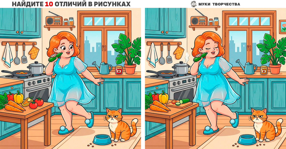 Новая задачка на внимательность. Хорошенько рассмотрите похожие картинки. Красивая рыжеволосая девушка поёт песню в воображаемый микрофон. Она представляет себя на сцене, хотя в этот момент готовит полезный завтрак. А из зрителей на её концерт пришёл лишь рыжий кот. И тот недоволен происходящим, потому что хочет есть. Найдите 10-ть различий, которые сделал художник. Это полезное упражнение на развитие и поддержание жизненно важных функций мозга. Поэтому старайтесь найти всё самостоятельно, не прибегая к помощи подсказки. Её я оставлю в конце статьи для сверки ваших результатов. Горизонтальный вариант: Утренняя звезда Вертикальный вариант: Утренняя звезда ОТЛИЧНО! ТУТ ЕСТЬ ЕЩЁ ПОДОБНЫЕ ЗАДАНИЯ: ПОДСКАЗКА-ОТВЕТ: