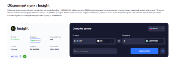 Insight – надежный обменник с большим опытом работы и стабильной репутацией на рынке криптовалют.