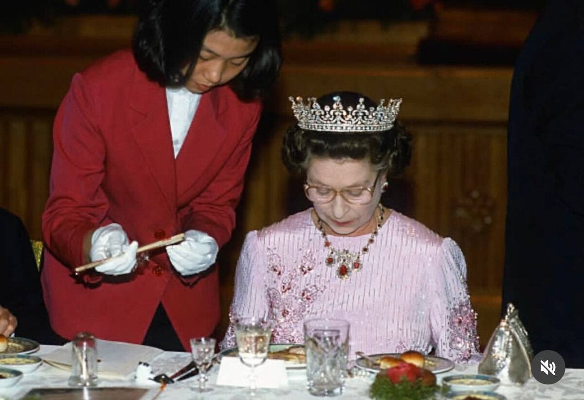 ». Королева Елизавета II во время ожидания своих палочек для еды на государственном банкете в ее честь в рамках визита в Пекин в 1986 году. Остаемся на связи в MAX!