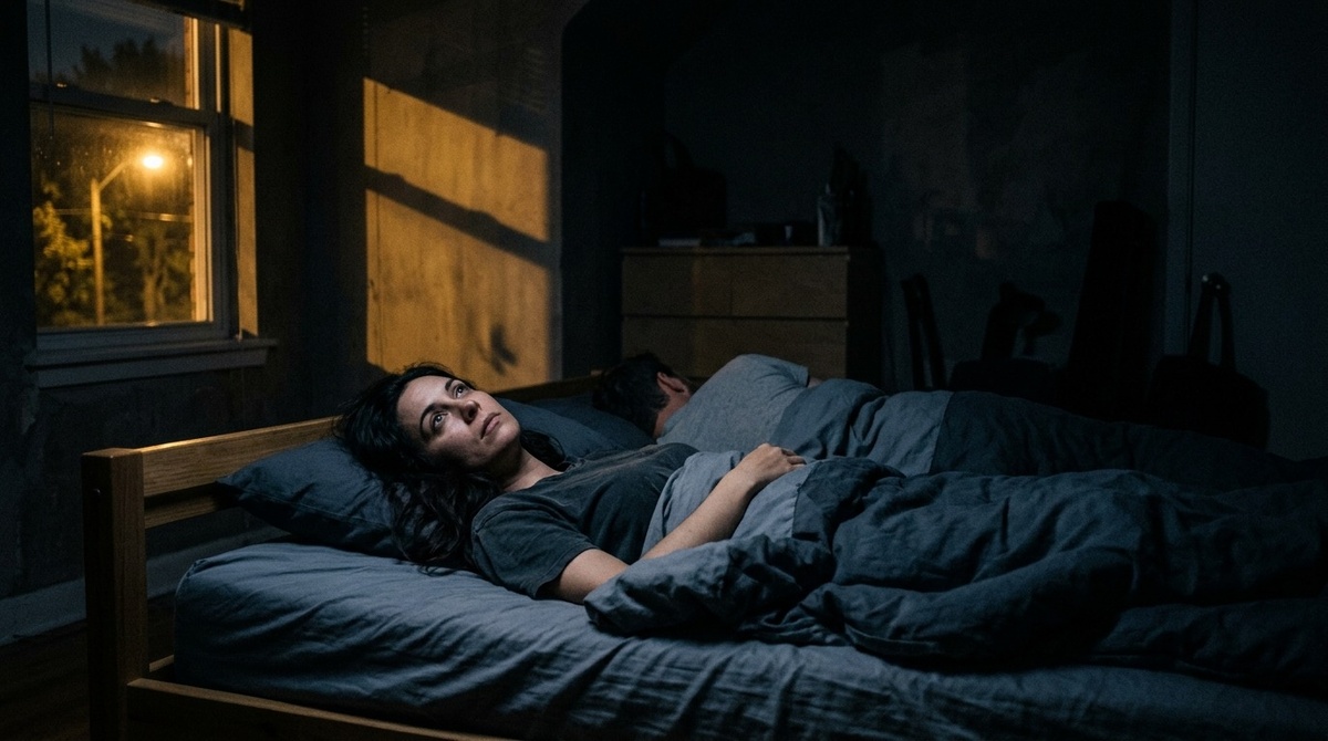 Первая ночь в съёмной квартире. Комната небольшая, чужая – чужой запах, чужие обои в мелкий рисунок, окно выходит во двор. Кровать скрипит. За стеной иногда слышно телевизор соседа – тихо, неразборчиво, почти как белый шум.