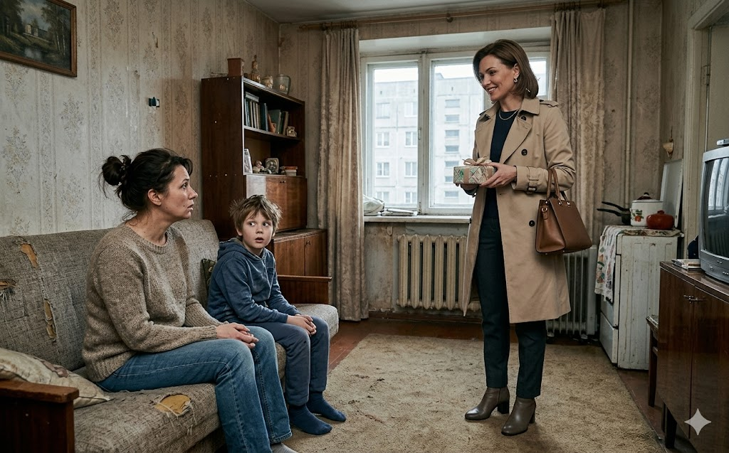 Артём стоял в дверях комнаты, сжимая в руках кисточку. Он переводил взгляд с блестящей, пахнущей дорогими духами женщины на свою маму Веру — постаревшую, в застиранном халате, чьи руки мелко дрожали.