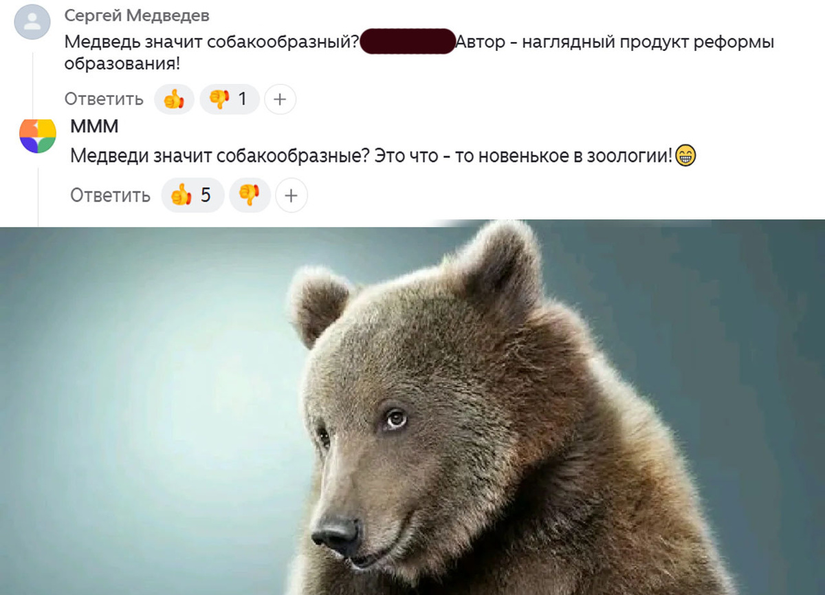 Тема медведей интересует многих. Под заметками всегда сотни комментариев, обычно с интересными дополнениями и рассказами, но иногда с упреками в недостаточной осведомленности автора, "который, видимо, прогуливал школьные уроки биологии". Но нет, я их никогда не прогуливала, именно поэтому, не ожидая подвоха, однажды в заметке указала, что медведь относится к собакообразным. Ну все же об этом знают – пронеслось у меня в голове. Ан нет! Сразу посыпались замечания. Видимо, эта тема стоит отдельной заметки. В общем, да: биологическая систематика – шутка сложная, в ней легко запутаться. Но медведь действительно собакообразное животное, ошибки нет. И если кому-то кажется, что его пёс смахивает на медведя – ему не кажется. Смотрим в классификацию: отряд плацентарных млекопитающих под названием "хищные" делится на два подотряда: кошкообразные и собакообразные. К первым относятся 7 современных семейств животных, среди которых – кошки всех размеров, мангусты, сурикаты и прочие гибкие создания