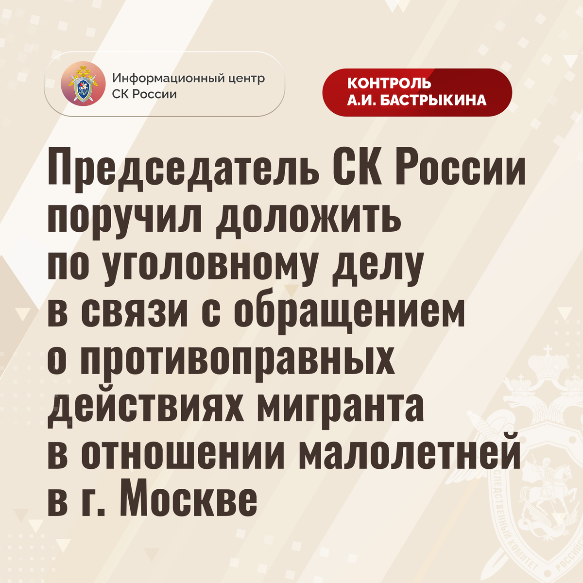 Председатель СК России поручил доложить по уголовному делу в связи с обращением о противоправных действиях мигранта в отношении малолетней в г. Москве К Председателю СК России А.И. Бастрыкину через Информационный центр обратился житель города Москвы по вопросу несогласия с ходом установления обстоятельств совершения противоправных действий в отношении его четырехлетней дочери. В декабре 2024 года мигрант, забирая своего ребенка из детского сада, из-за ранее возникшего между детьми конфликта, завел дочь заявителя в раздевалку, после чего стал угрожать ей физической расправой. Помощь малолетней оказала воспитательница. Пострадавшая проходит лечение в связи с перенесенным стрессом. До настоящего времени никто к ответственности не привлечен. Указанная ситуация освещалась в сети Интернет. В ГСУ СК России по городу Москве расследуется уголовное дело, возбужденное по поручению А.И. Бастрыкина. Председатель Следственного комитета Российской Федерации Александр Иванович Бастрыкин поручил руков