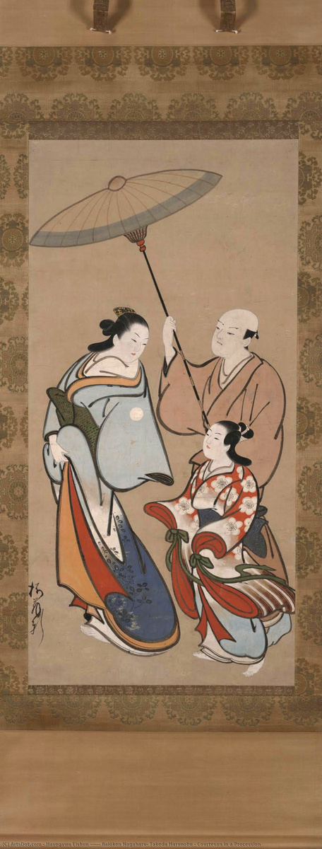 Картины укиё-э — это проницательное отражение жизни в развлекательных кварталах японских городов в период Эдо (1615–1868). На картинах, отличающихся чувственностью, эмоциональностью и декоративностью, часто изображались прогулки и развлечения горожан, а также роскошно одетых куртизанок и их покровителей. Рассматриваемый свиток показывает рутинную для того времени сцену: величественная куртизанка гордо идет по улицам. Она оборачивается, чтобы посмотреть на свою молодую служанку, которая идёт рядом в длинном кимоно фурисодэ, предназначенном для незамужних девушек. Мужчина-слуга, держащий зонт над куртизанкой, является символом её статуса. О художнике Байокене Эйшуне (ок. 1710–1755) известно довольно мало. Он был последователем школы укиё-э Кайгэцудо и, как и другие представители этой школы, писал портреты куртизанок, живших в развлекательном районе Ёсивара в Эдо (современный Токио). Поза куртизанки, поворачивающейся, чтобы посмотреть назад, её длинный левый рукав, свободно свисающи