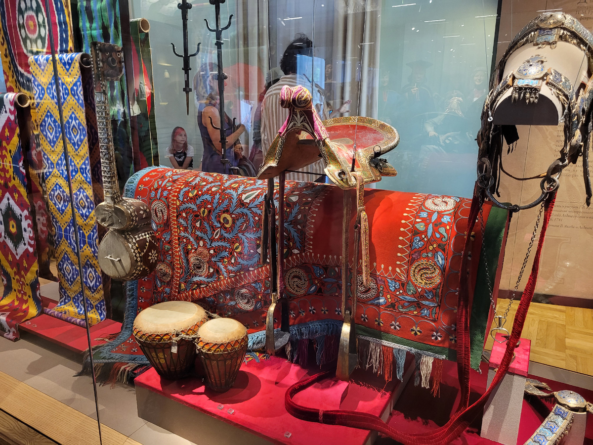 В российских музеях в качестве экспонатов представлена всевозможная амуниция для лошадей, начиная от снаряжения крестьянских рабочих лошадок и заканчивая пышным убранством коней царственных особ. В рыцарских залах Государственного Эрмитажа можно посмотреть на доспехи средневековых коней Востока и Запада, Из собраний Царскосельского Арсенала в Эрмитаж были также перевезены предметы, составлявшие часть комплекса снаряжения воина-всадника практически с античных времён.. В этот пост добавила фотографии из Имперского зала Кунсткамеры – витрина «Дары эмиров бухарских российским императорам» (особенно удивлять дорогими подношениями любил частый гость при российском дворе — бухарский эмир Абд ал-Ахад. Много даров привез из Путешествия на Восток цесаревич Николай Александрович, будущий император Николай II); экспонаты постоянной выставки в Российском этнографическом музее «Народы Средней Азии и Казахстана. Конец XIX – начало XX в.»; экспонаты постоянной выставки в Российском этнографическом му