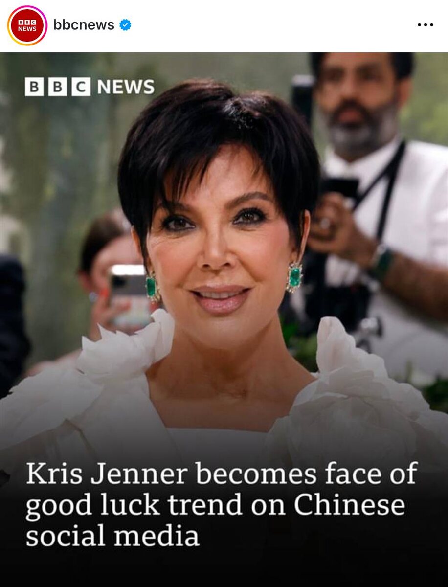 Китайцы в китайских соцсетях пересылают друг другу изображения Крис Дженнер «на удачу». Считается, что она приносит благополучие и богатство.