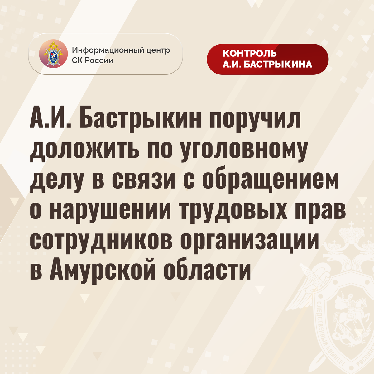 А.И. Бастрыкин поручил доложить по уголовному делу в связи с обращением о нарушении трудовых прав сотрудников организации в Амурской области