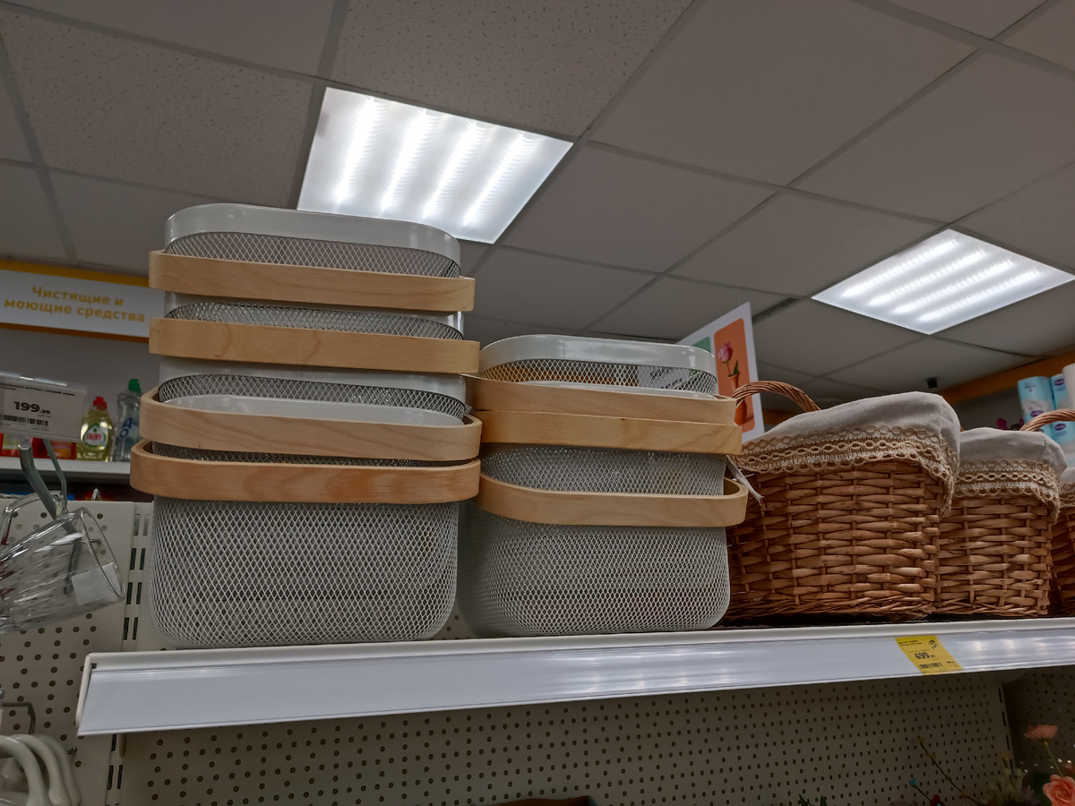 Начну с верхней полки секции с товарами для кухни. Интересные корзинки вижу! один в один из Чижика. Ценника под ними на полке нет, у продавца спросила - не смогла сказать сколько стоит. Сказала только, что еще не успели распечатать, товар недавно выставили...