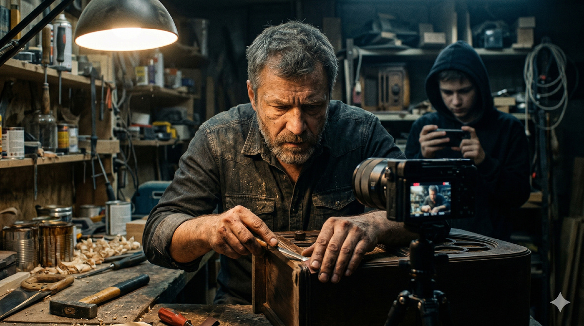 Я тихо подошла к приоткрытой двери. Посреди комнаты стоял штатив с Денисовым телефоном, а перед ним, на старом табурете, сидел мой муж. Вокруг были разложены какие-то деревяшки, наждачная бумага, банки с морилкой. Андрей пытался на камеру рассказать, как правильно зашкурить старую древесину, чтобы сохранить ее фактуру. Он запинался, краснел, переснимал один и тот же дубль раз десять. А наш пятнадцатилетний сын, который последние полгода вообще не вылезал из своего смартфона и огрызался на любое замечание, стоял рядом и терпеливо выступал в роли режиссера.