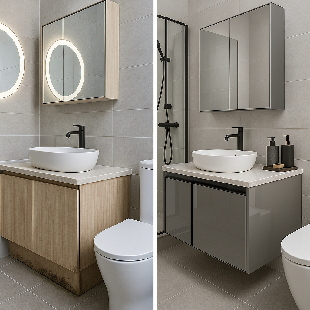 Почему умрет: Эти плиты впитывают влагу из воздуха, как губка. Результат — вздутые дверцы, расслоение столешницы и вечный запах сырости из-под раковины. Особенно быстро это происходит с тумбами под умывальником.