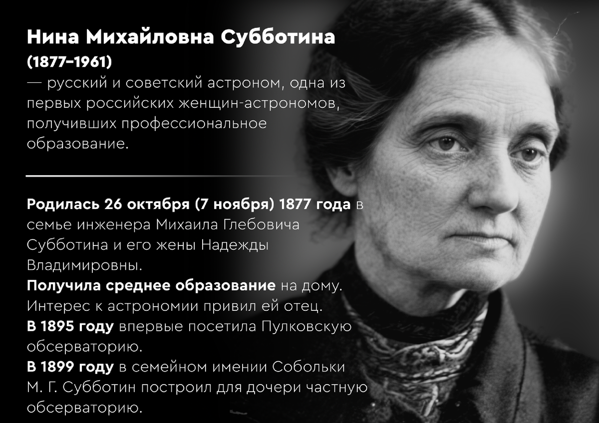 Нину Михайловну часто называют «российским Хокингом в юбке». И не зря. Как и он, она превратила физические ограничения в преимущество: тишина позволяла сосредоточиться, а переписка с коллегами — от Н. А. Морозова до иностранных астрономов — сохранила для нас живую картину астрономии XX века. Она состояла в Бельгийском и, по некоторым сведениям, Французском астрономических обществах, вела обширную переписку, публиковалась в престижных журналах. Астрономия для неё была не профессией — страстью, которая переживала и революции, и войны, и личные утраты. Сегодня о ней знают благодаря книге Ольги Вальковой «Жизнь и удивительные приключения астронома Субботиной» — там собраны её письма, архивные документы, которые раньше никто не публиковал.