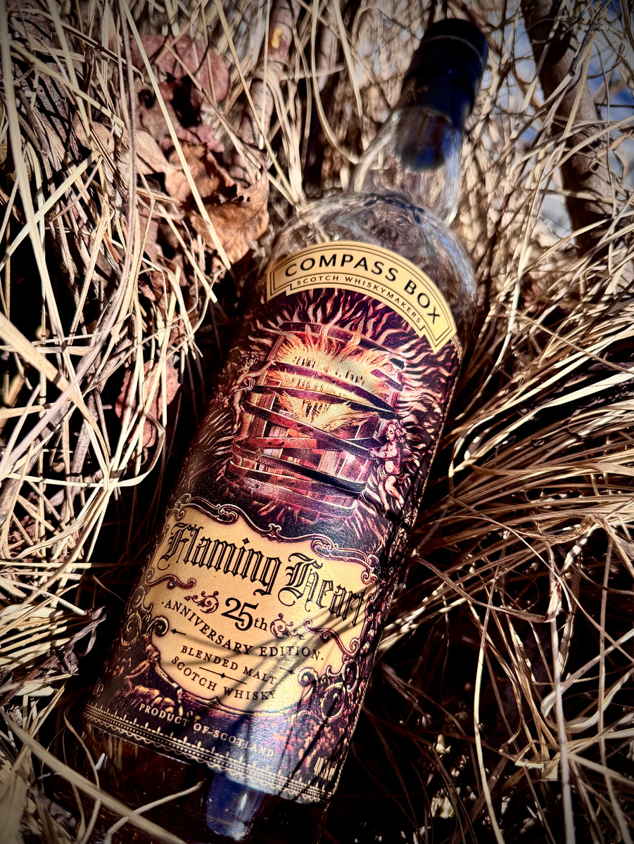 Здорова народ! И снова в ангаре прятки, а если быть точнее - слепая дегустация. Настроил я датчики, достал бокал, налил и понеслась! Моим сегодняшним гостем оказался Compass Box Flaming Heart 25th Anniversary Edition. Джон Глейзер, этот главный инженер-бунтарь индустрии, снова доказал: его творения из категории Blended Malt могут не просто ехать, а вваливать на уровне самых породистых Синглов! Данный релиз был выпущен в честь 25-летия компании Compass Box. В купаж вошли спирты - Benrinnes (35,5%), Laphroaig (3%), Williamson (13,4%) и, особенно, Talisker (48,1%), выдержанные в разного рода бочках аж до 17 лет. Разлит в 2024 году при крепости 48.9% vol, тиражом 9384 бутылки. Василий Шпала (желая внести ясность): «Бро, это не просто 17 лет дабы где, тут нужна ремарочка. Спирты от Benrinnes выдерживали в сильно обожженных бочках из французского дуба. Talisker - в новых обожженных американских Хогсхедах. Спирты Williamson созревали в американских бочках повторного наполнения, а капелька La