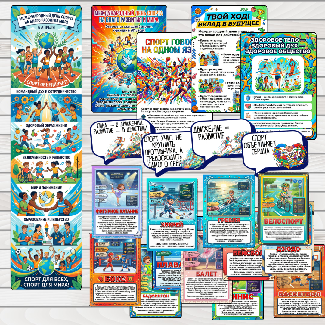 ✅ Виды спорта (17 листов А4) — красочные изображения разных спортивных дисциплин! Можно сделать гирлянду, оформить «аллею спорта» или использовать для викторин.
