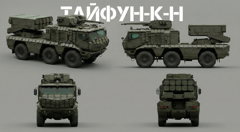 К середине 2030-х годов концепция узкоспециализированных машин на поле боя окончательно устарела. Конфликты нового типа требовали от техники предельной универсальности: способности подавлять пехоту, уничтожать тяжёлую бронетехнику и бороться с роями беспилотников. «Тайфун-К-Н» стал кульминацией развития платформы «Тайфун». Разработчики отказались от десантного отделения в пользу массивной универсальной пусковой установки и усиленного бронирования. Машина получила неофициальное прозвище «Громовержец» за способность наносить сокрушительные удары с закрытых позиций, оставаясь при этом грозным противником в ближнем бою благодаря модулю «Спица-М». Бронирование (корпус) Комбинированная+ДЗ Многослойная броня (сталь+керамика+композит), усиленная встроенной динамической защитой «Реликт-К» третьего поколения. Лоб корпуса и кабина надежно защищены от 30-мм бронебойных снарядов. Бо