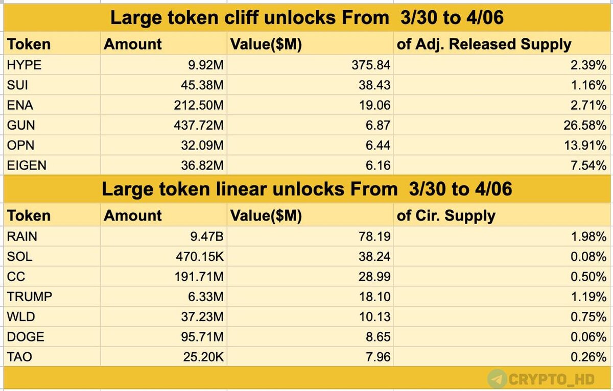 🔓 ТОП разблокировок токенов с 30 марта по 6 апреля! Cliff Unlocks: ▫️#HYPE - $375,84m ▫️#SUI - $38,43m ▫️#ENA - $19,06m ▫️#GUN - $6,87m ▫️#OPN - $6,44m ▫️#EIGEN - $6,16m Linear Unlocks: ▫️#RAIN - $78,19m ▫️#SOL - $38,24m ▫️#CC - $28,99m ▫️#TRUMP - $18,10m ▫️#WLD - $10,13m ▫️#DOGE - $8,65m ▫️#TAO - $7,96m P.S. Cliff Unlocks – разблокировка крупной порции токенов единовременно в конкретную дату. Linear Unlocks – постепенная разблокировка токенов в течение определенного периода (обычно каждый день или каждую неделю по части). Crypto Headlines