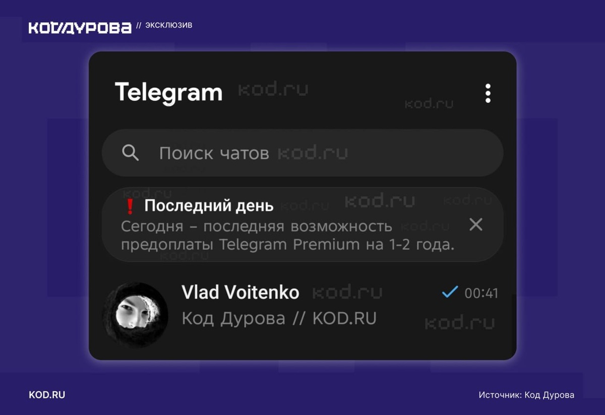 «Код Дурова» получил сообщение в котором говорится, что «Сегодня — последняя возможность предоплаты Telegram Premium на 1-2 года». Пока что функция тестируется разработчиками в закрытом режиме. На текущий момент неизвестно, идёт ли речь о том, что сам мессенджер закроет возможность покупки подписки на такой срок, или это тест на случай блокировки такой возможности со стороны властей — заявили в редакции «Кода Дурова» #оффтоп@inyoueyes