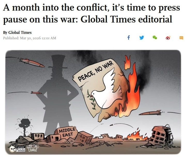 «Прошел уже полный месяц с тех пор, как США и Израиль начали наносить 28 февраля военные удары по Ирану. Далеко не достигнув своих так называемых запланированных целей, этот конфликт, инициированный США и Израилем без всякого оправдания на фоне переговоров, вместо этого постепенно вышел на грань потери контроля Der Krieg zwischen den USA und Israel und dem Iran droht laut der Global Times außer Kontrolle zu geraten. „Seit dem Beginn der Militärschläge der USA und Israels gegen den Iran am 28. Februar ist ein ganzer Monat vergangen. Weit davon entfernt, die sogenannten geplanten Ziele zu erreichen, hat sich dieser Konflikt, der von den USA und Israel ohne jegliche Rechtfertigung inmitten laufender Verhandlungen begonnen wurde, immer weiter zugespitzt und steht kurz davor, außer Kontrolle zu geraten.“