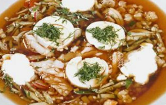 Ингредиенты: - 0,4 л кваса - 30 г картофеля - 50 г квашеной капусты - 40 г моркови - 50-60 г зеленого лука - 40 г редиса - 50 г свежих огурцов - 2 яйца - сахар - соль - горчица - укроп по вкусу Приготовление: Отваренные картофель и морковь нарезать кубиками. Так же нарезать свежие огурцы и редис, добавить мелко нарезанную квашеную капусту и зеленый лук, положить в кастрюлю, залить квасом, добавить белки рубленого вареного яйца, желток растереть с солью, сахаром и горчицей. Залить квасом, заправить укропом и сметаной.