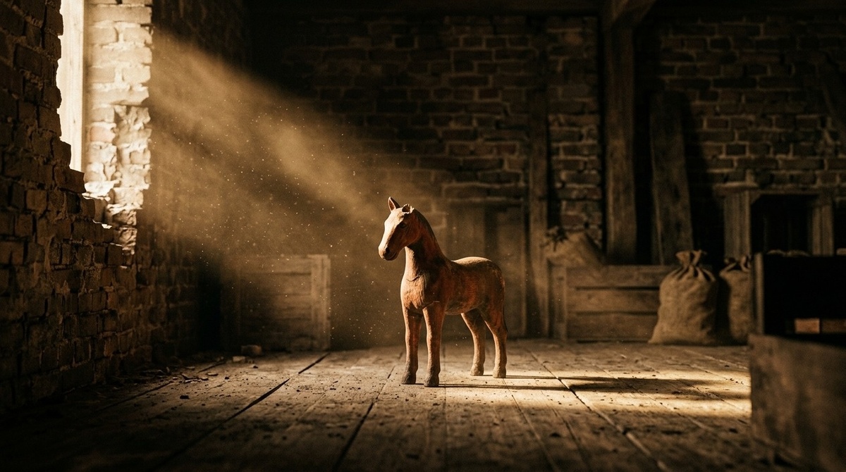 Я подошла. Наклонилась, но сначала не взяла её – просто смотрела. Рыжевато-коричневая лошадка на четырёх ногах, одно ухо чуть сколото по краю. Небольшая, чуть крупнее кулака. Дерево за сто лет потемнело, но не рассыпалось.