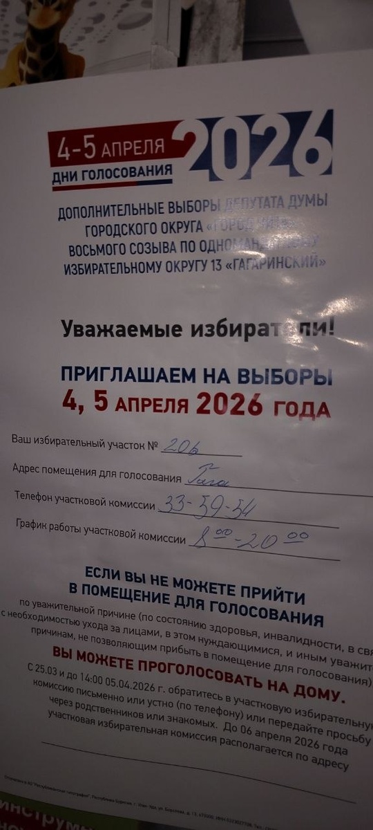 По адресу 3-я Забайкальская, 2, читинец заметил листовку с приглашением на довыборы депутата гордумы по Гагаринскому округу. Там отметили номер избирательного участка, время его работы и телефон участковой комиссии, но вместо адреса указали некое место с интересным названием «Гага». С помощью постановления мэрии Читы удалось найти потерянный адрес — голосовать нужно на Гагарина, 1, в здании школы №16. В границы этого участка попадают дома на Гагарина, кроме №4 и №5, а также дома на Славянской. Фото: очевидец 📌📌📌📌📌 «Чита.Ру» в MAX