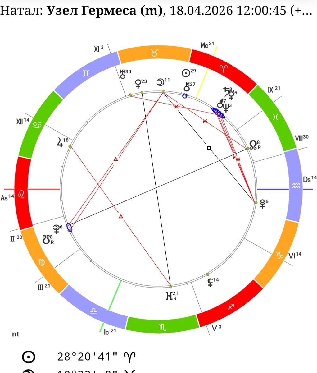 В эзотерической традиции конфигурация, где встречаются Личная планета (Меркурий), Социальная (Марс), Кармическая (Сатурн) и Высшая (Нептун), называется «Узлом Гермеса» (Трисмегиста). В этой точке мироздание дает нам уникальный «сбой в матрице»:
