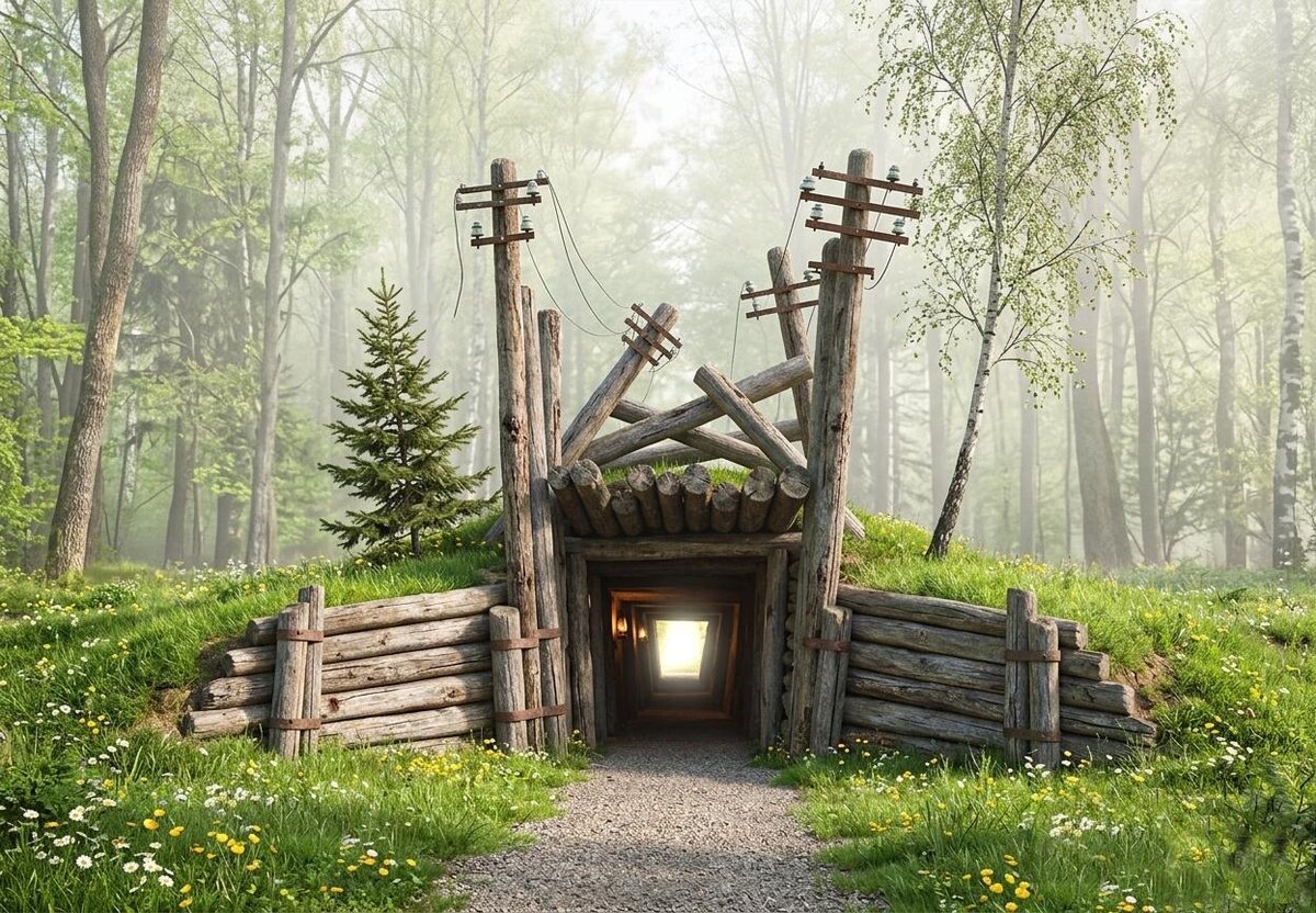 Для того же тарусского парка разрабатывался и ещё один объект ланд-арта. Он мог бы служить дополнительным входом или особым выходом из парка. А подтолкнуло к его созданию то, что на границе территории нашлись загадочные земляные сооружения, в которых угадывались остатки бревенчатых элементов. И то ли это были земляные укрытия, то ли хранили там картофель, но молва связывала их со временем войны, когда здесь прошел фронт и Таруса ненадолго была под оккупацией... И предложили мы вот что : Инсталляция с историческим контекстом. Тоннель уходит в укреплённую брёвнами траншею образца начала-середины 20-го века. Вход в неё образуют почти стоящие вертикально винтажные телеграфные столбы, которые постепенно клонятся к центру композиции и образуют кровлю блиндажа в виде наката брёвен... Такие же основания столбов крепят лежащие горизонтально брёвна справа и слева. Внутрь уходит гравийная аккуратная дорожка для экскурсантов. На обваловке крыши растут травы и молодые деревца - слева ёлочка, сп