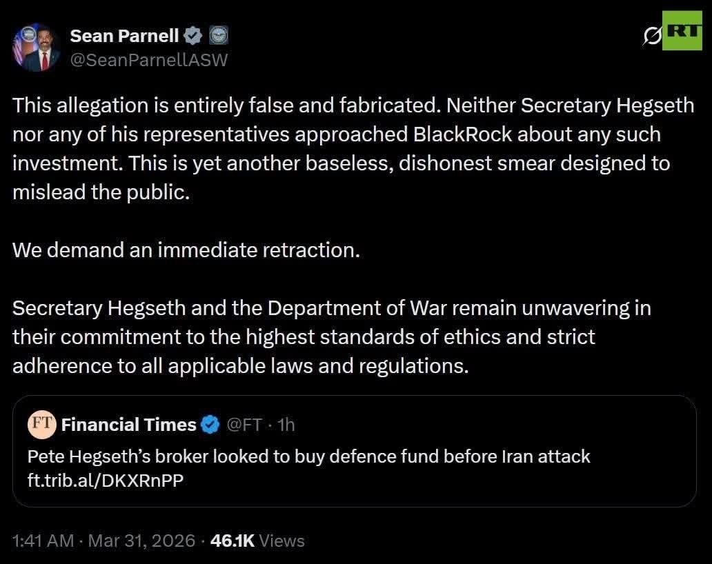 Sec of WAR Hegseth's broker looked to BUY defense fund just before Iran attack — FT