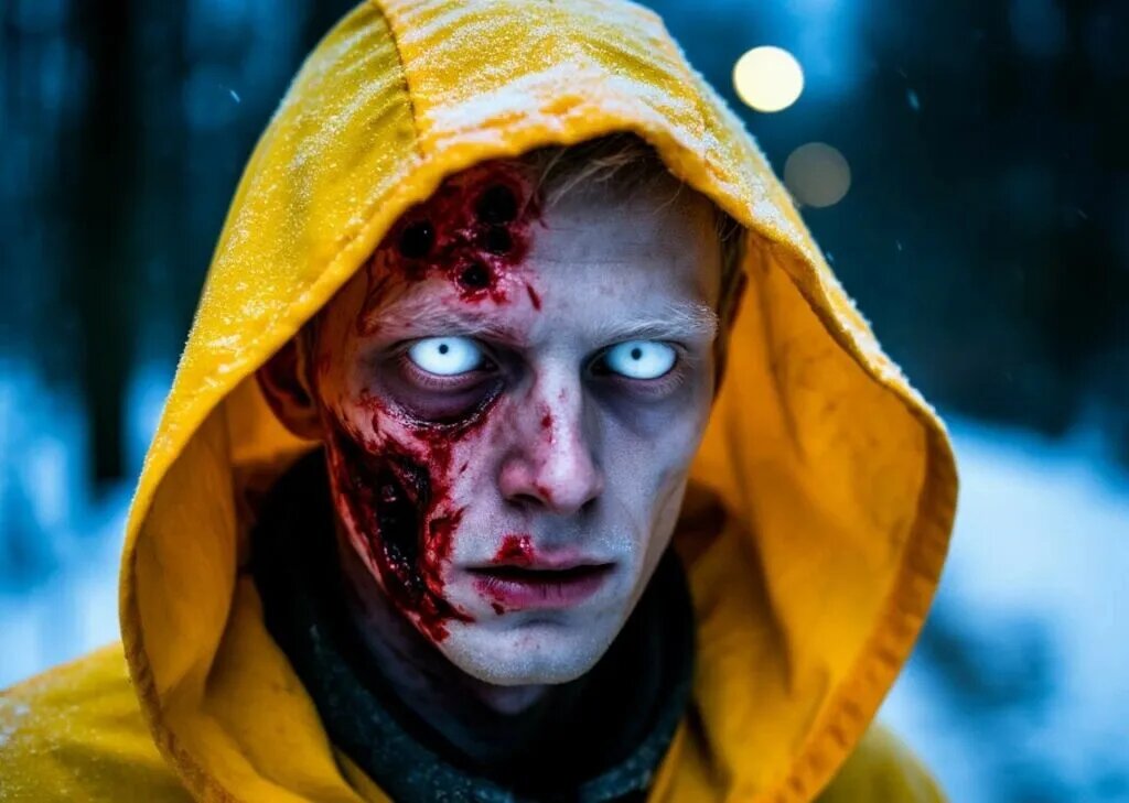Марк почувствовал, как по спине пробежал ледяной озноб. Лицо незнакомца, освещённое фарами, было изуродовано до неузнаваемости. Кожа выглядела обожжённой, покрытой красными язвами и глубокими деформациями. Но самое жуткое — глаза. Они были совершенно белыми, без зрачков и радужки. Казалось, что они смотрят не на Марка, а сквозь него, в самую глубину его души.