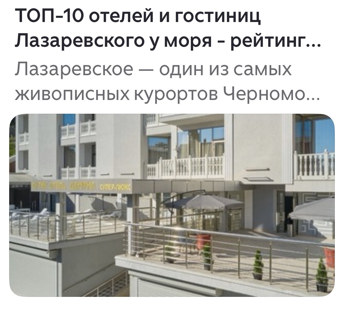 Листая «полезные советы» про родной посёлок Лазаревское, наткнулся я на статью с громким названием «10 лучших отелей». Автор скромно величает себя «Супер туризм» (название изменено, чтобы не позорить слово «супер»). Цитата: «Мы собираем топовые рейтинги отелей, экскурсий, туров и мест для отдыха, чтобы вам не пришлось тратить время на поиски. Мы анализируем, сравниваем и даём честные рекомендации».