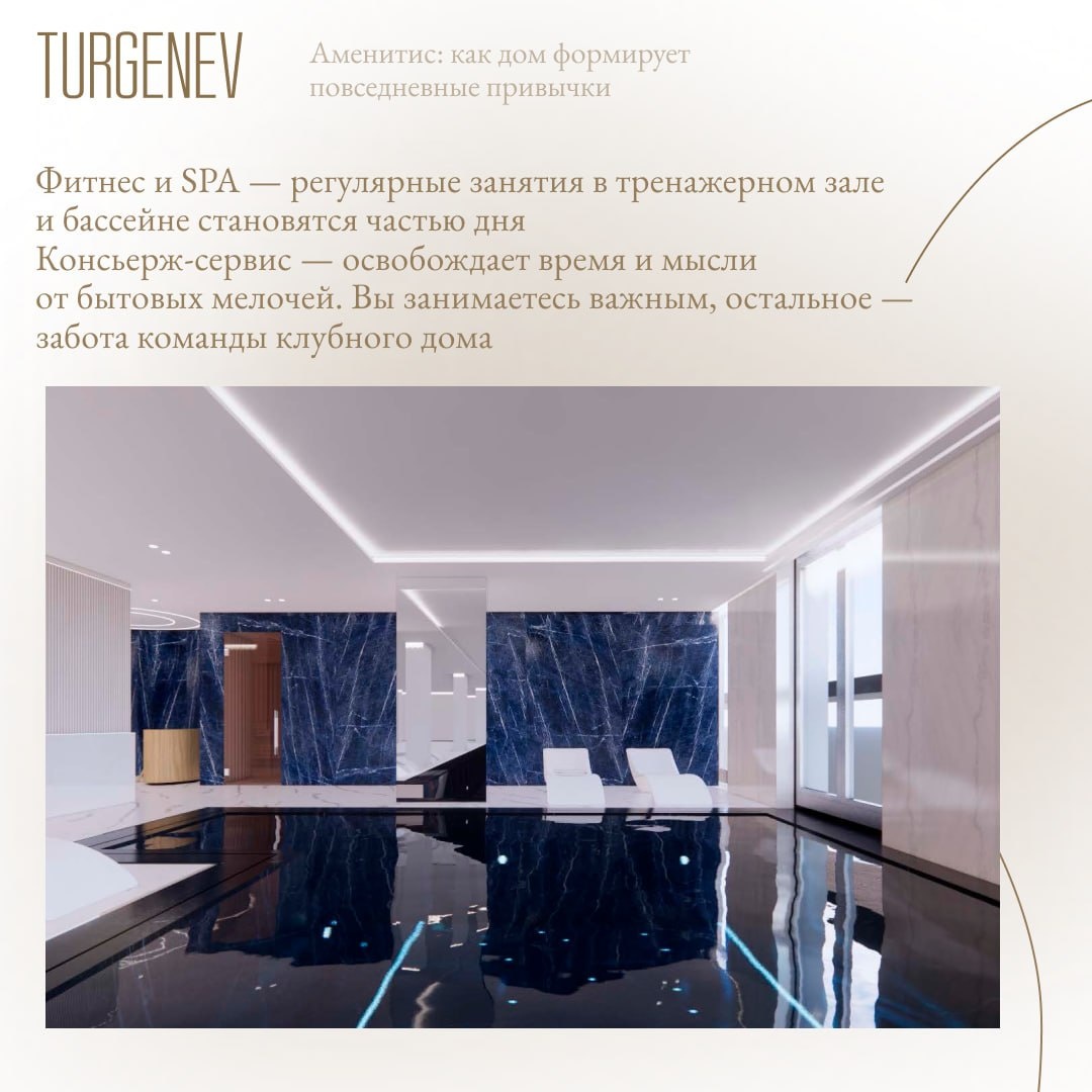 Понятие аменитис (от англ. amenities — услуги, удобства) пришло из гостиничного мира. Это среда, которая формирует привычки и ритм жизни. В TURGENEV мы создали несколько пространств, которые становятся естественным продолжением вашей квартиры. 🌳 Закрытый двор-сад Привычка гулять перед сном или встречать утро среди зелени — здесь она возникает сама собой. Никаких шумных улиц, только тишина и ухоженные аллеи. 💪 Фитнес и SPA Тренажерный зал и спа-зона с бассейном — в двух шагах от лифта. Регулярные занятия становятся частью повседневной рутины. 🛎 Консьерж-сервис Прием посылок, помощь с вызовом мастера, организация бытовых мелочей — это освобождает ресурсы для действительно важных дел. 🍽 Ресторан на первом этаже Завтрак без спешки, деловая встреча или ужин с друзьями — все это рядом с домом, без необходимости куда-то ехать. TURGENEV не просто предоставляет сервисы. Он формирует образ жизни — осознанный, комфортный и здоровый. #TURGENEV #клубныйдом #качествожизни #инфраструктура