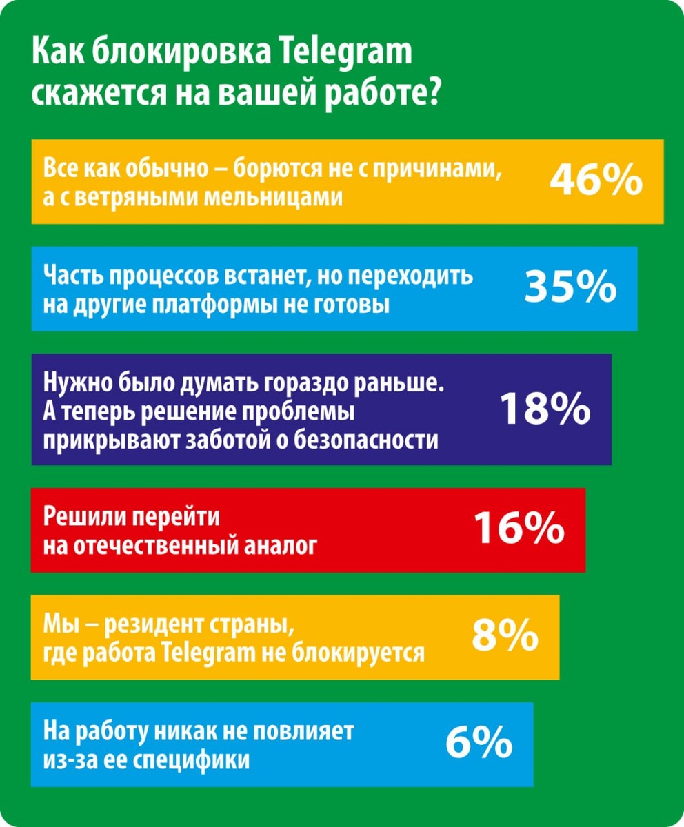 Результаты ПЛАС-Опроса от 30 марта Напоминаем, мы проводили опрос "Как блокировка Telegram скажется на вашей работе?" Почти половина опрошенных (46%) на вопрос, как блокировка Telegram скажется на их работе, ответила: все как обычно – борются не с причинами, а с ветряными мельницами. Чуть больше трети респондентов (25%) призналась: часть процессов встанет, но переходить на другие платформы они пока не готовы. В свою очередь, 18% читателей считают, что тем, кто отвечает за данное направление создания собственных национальных мессенджеров и задачи миграции на них, нужно было думать гораздо раньше, а теперь решение проблемы прикрывают заботой о безопасности. При этом 16% наших читателей уже приняли непростое решение перейти на отечественный аналог Telegram, несмотря на ожидаемые значительные потери клиентов и другие негативные последствия данной миграции. 8% счастливчиков отметили, что вопрос для них неактуален: «Наша компания – резидент страны, где работа Telegram не блокируется».