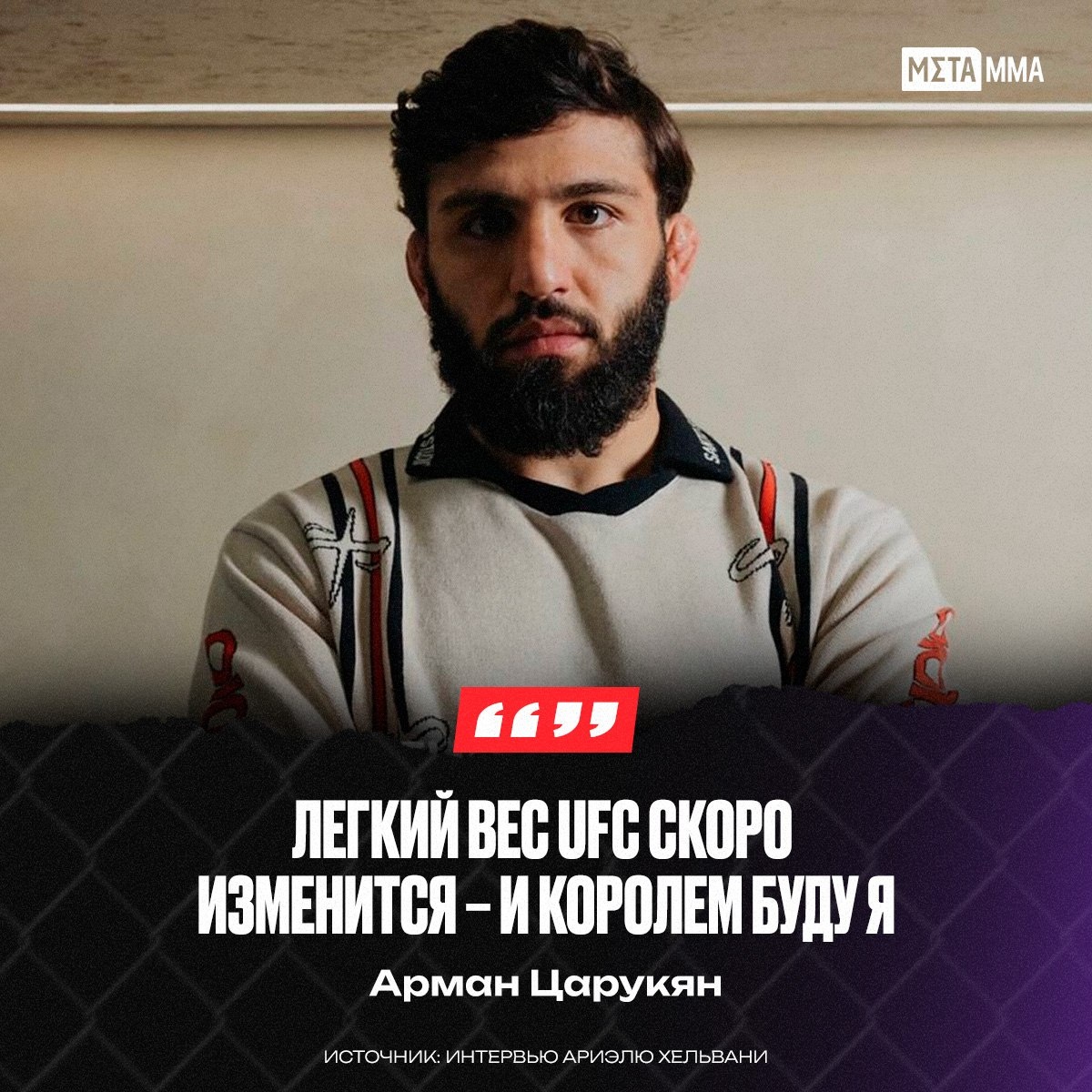 Арман Царукян заявил, что лёгкий дивизион UFC скоро ждут серьёзные изменения — и он намерен забрать трон. «Легкий вес UFC скоро изменится – и королем буду я. Я не знаю, почему они дают шансы этим старикам – Гейджи, Оливейре… Нам нужны новые имена. Есть парни, которые только попали в топ-15 – дайте им шанс подраться с ребятами из топ-5», – заявил Царукян в интервью Ариэлю Хельвани. ❓Верите, что Царукян станет чемпионом? 🔥 — Да, его время пришло 🤔 — Нет 👊 Подпишись на Meta MMA | Meta MMA в MAX | Наш канал в ВК