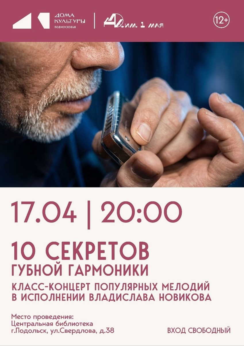 ✨ 10 секретов губной гармоники 💥 🪗Концерт популярных мелодий в исполнении Владислава Новикова 🚫 Возраст: 12+ 📆 17.04.2026 🕒 20:00 🏢 Центральная библиотека 📍 г. Подольск, ул. Свердлова, д. 38 💰 Вход свободный❗️ ⭐Поддержать канал голосом 🍰Где поесть в Подольске ✅ Мероприятия Подольск https://dzen.ru/id/66ed500f7b5671493eca3fd6 https://vk.ru/podolsk_events http://dzen.ru/podolsk_events