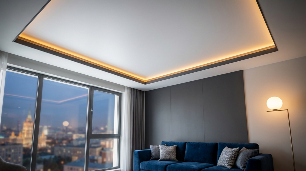 Минимальный отступ составляет всего 3 сантиметра. Если вы используете встроенные светильники или планируете скрыть коммуникации (вентиляцию, проводку), потолок может опуститься на 7–10 см. Для квартир с низкими потолками в Москве мы рекомендуем использовать тонкий алюминиевый профиль, чтобы сохранить максимум пространства.