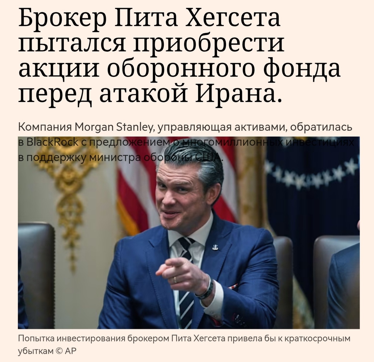 По словам трех источников, знакомых с ситуацией, брокер, работающий на министра обороны США Пита Хегсета, пытался осуществить крупные инвестиции в ведущие оборонные компании за несколько недель до американо-израильской атаки на Иран. После публикации статьи в Financial Times главный пресс-секретарь Пентагона Шон Парнелл написал в социальной сети X: «Это утверждение совершенно ложно и сфабриковано. Ни министр Хегсет, ни кто-либо из его представителей не обращались в BlackRock по поводу подобных инвестиций» https://www.ft.com/content/744ea8dc-6d93-4fe9-a5e3-36de4f5d06db BlackRock и Morgan Stanley отказались от комментариев. Хегсет является одним из главных архитекторов войны в Иране, а также одним из самых ярых сторонников нападения на Исламскую республику в администрации Трампа, часто демонстрируя военную мощь США @marketheart