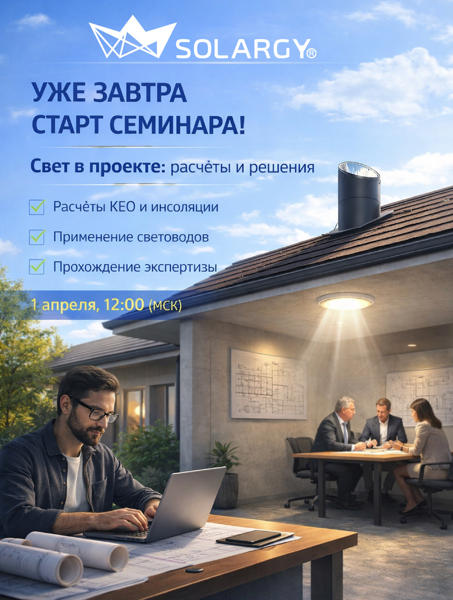 Уже завтра стартует онлайн-семинар SOLARGY Разберём, как работать с естественным освещением в проекте: — расчёты КЕО и инсоляции — применение световодов — прохождение экспертизы Практика, реальные кейсы и инструменты, которые можно применять сразу 🎁 Всем участникам — доступ к программе RUSKEO на 2 недели 🕛 Старт: 1 апреля в 12:00 (МСК) Успейте записаться: https://forms.yandex.ru/cloud/69023fcd02848f5918221dd7/