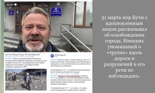- «31 марта мэр Бучи Анатолий Федорук с вдохновлённым лицом рассказывал об «освобождении» города. Никаких упоминаний о «трупах» вдоль дороги и разрушений в его речи не наблюдается. И только спустя двое суток поступает новая информация о «сотнях погибших»: «31 марта войдёт в историю нашего населённого пункта и всей территориальной общины как день освобождения от российских орков, российских оккупантов нашими Вооружёнными силами Украины наших населённых пунктов», — сообщает бучинский мэр с радостной улыбкой на лице», - анализировала позже ситуацию журналистка Юлия Витязева.