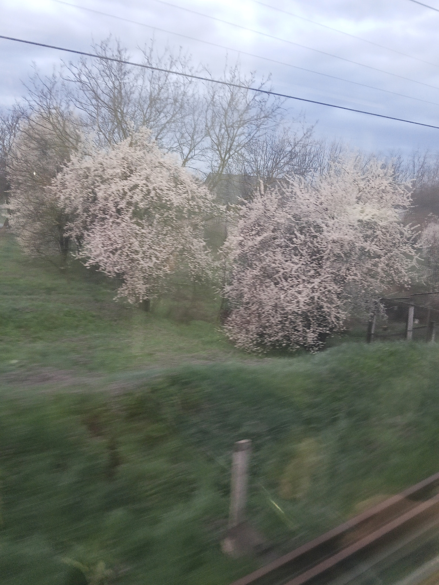 Я с младшим и средним сыновьями решили поехать на электричке рано утром. Сейчас, по моему мнению, самое лучшее время года для поездки на электричке, посмотрите какая красота за окном: