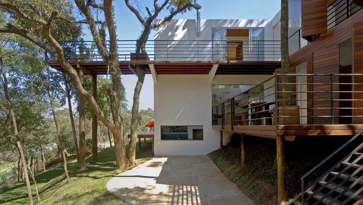 Это маленькая часть нашей уникальной коллекции, в которой сейчас более 9000 лучших домов со всего мира. В выборе нет никакой закономерности - проекты отобраны случайно. *** Этот дом разделён на три блока, разбросанных по территории, чтобы не мешать лесу и сохранить топографию. Блоки соединены между собой деревянными настилами. Верхняя палуба выходит сзади, пересекает дом и становится проходом в девяти метрах от земли, чтобы интегрироваться с верхушками деревьев. Дом площадью 158 м2 состоит из трёх горизонтальных модулей, расположенных на двух этажах, в городе Брумадиньо, в 30 минутах от Белу-Оризонти. Он встроен в крутую местность с уклоном 45 градусов и при минимальном необходимом движении грунта отсутствуют выемки земли, требующие подпорных стен. Проект уделял первостепенное внимание местным деревьям и учитывал большое присутствие жакаранд, которые пронизывают пространство. Главная спальня выходит окнами на лес, где нет соседей, а объединение происходит через большое окно. Движение